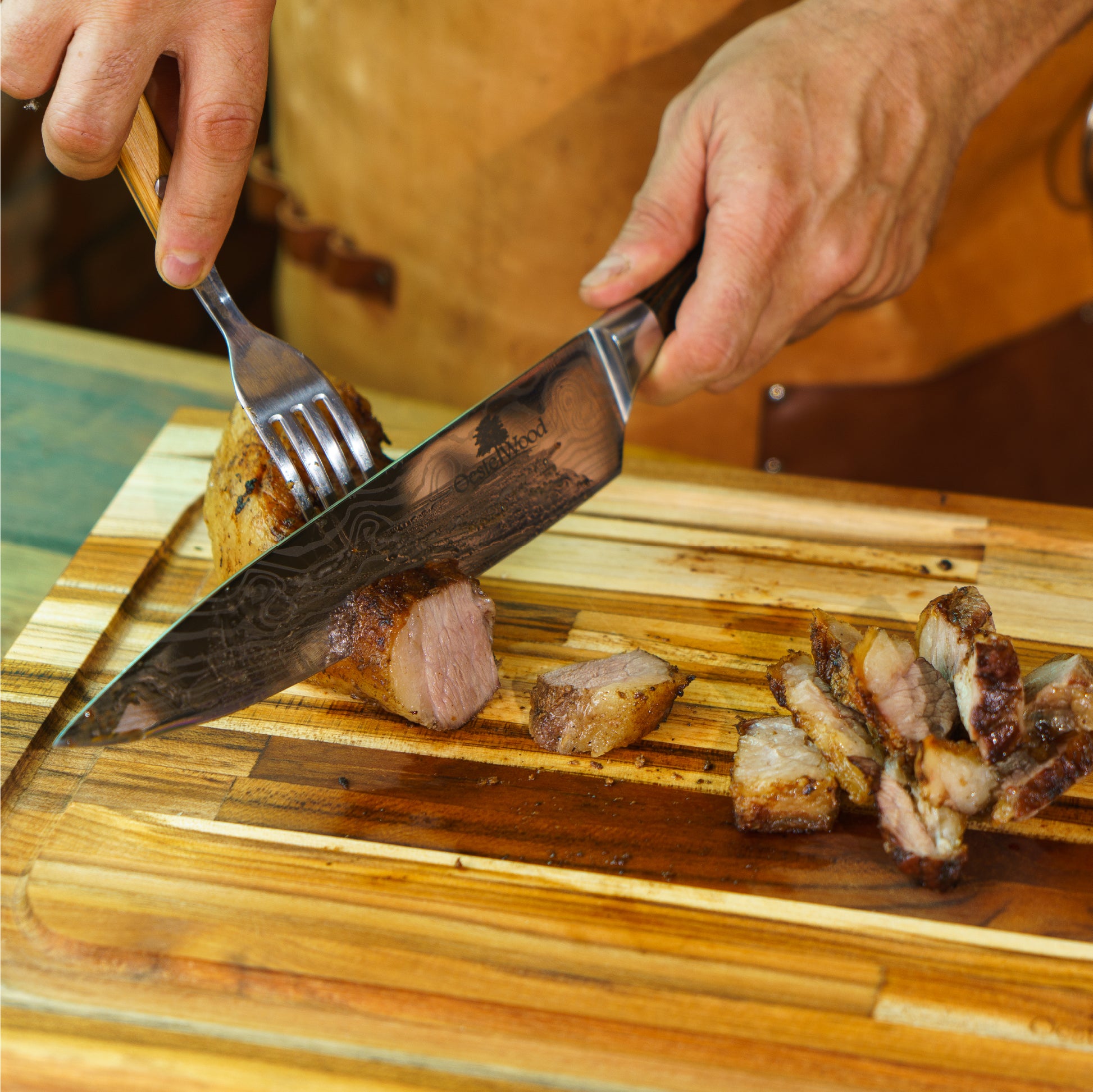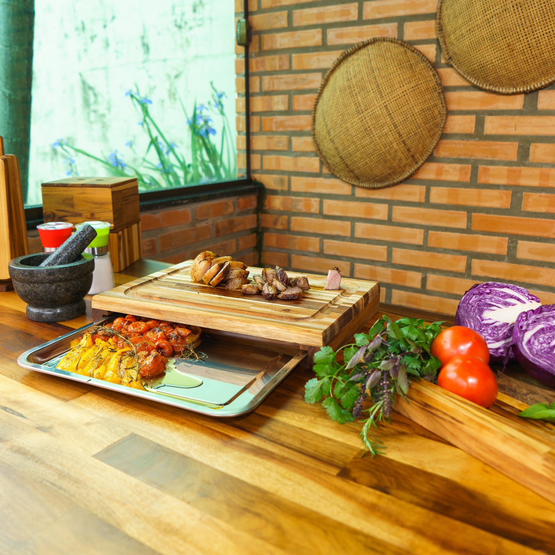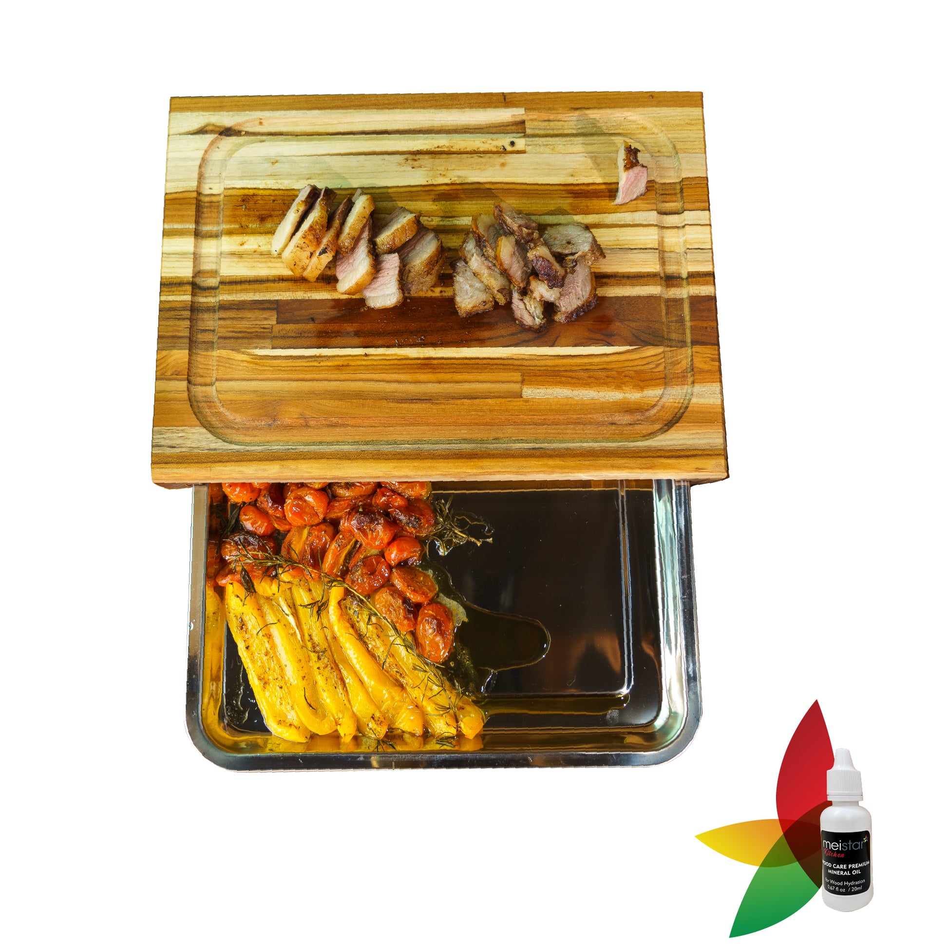 - End Grain Cutting Board: To make any barbecue even more special, nothing better than a beautiful meat board. The Teak Meat Chopping Board with large tray is a great option for cutting and serving meat, charcuterie, and snacks. It is also ideal for preparing and cutting vegetables.