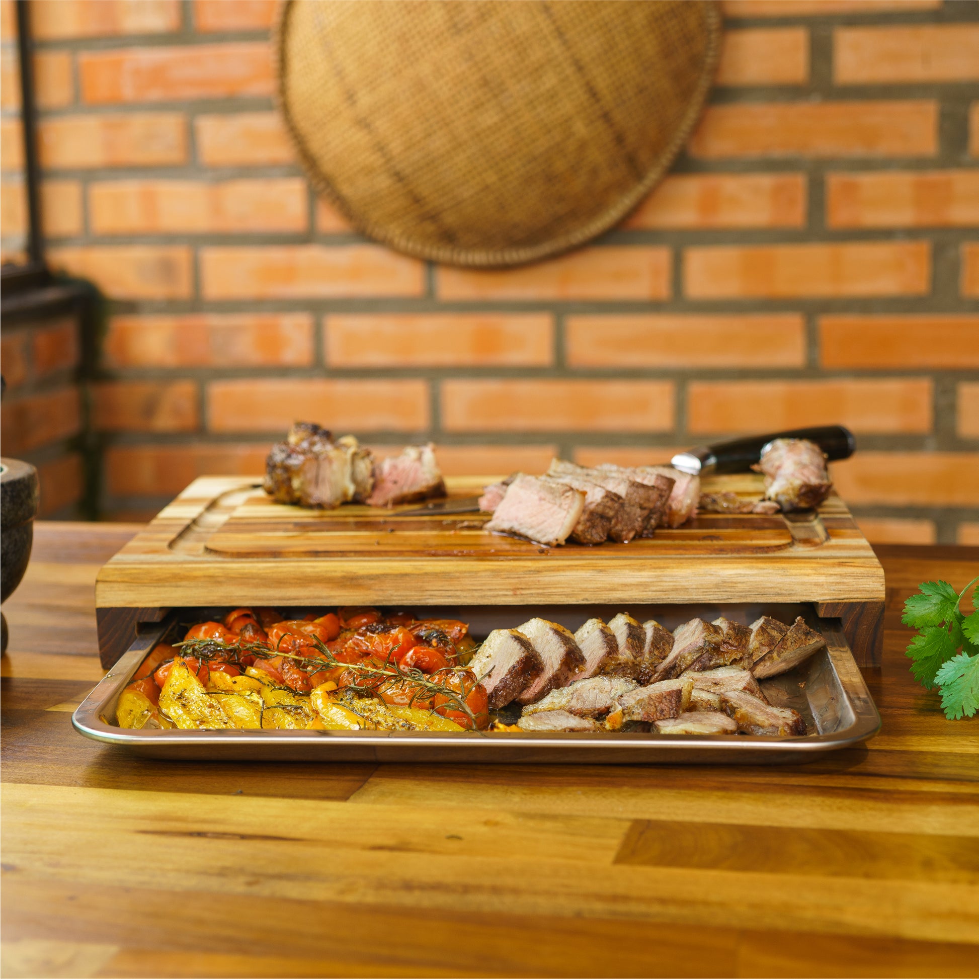 - Functional & Versatile: This butcher block is large enough to cut everything from meet and chicken to fruits and veggies and comes with an exclusive sliding stainless-steel tray that can be used to carry food to/from the grill or act as a serving tray. The deep juice groove efficiently catch any liquid during food preparation and serving.