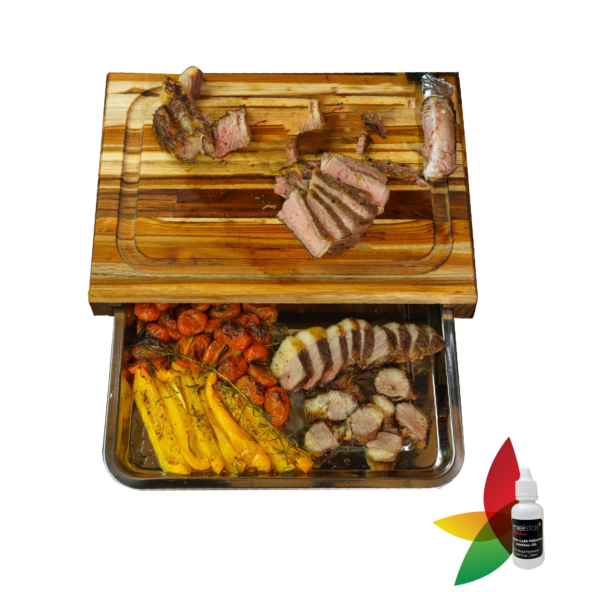 Meistar Master Chef Large End Grain Teak Wood Cutting Board. Thick Butcher Block for Kitchen, Brisket and BBQ with Stainless Steel Tray and Juice Groove.