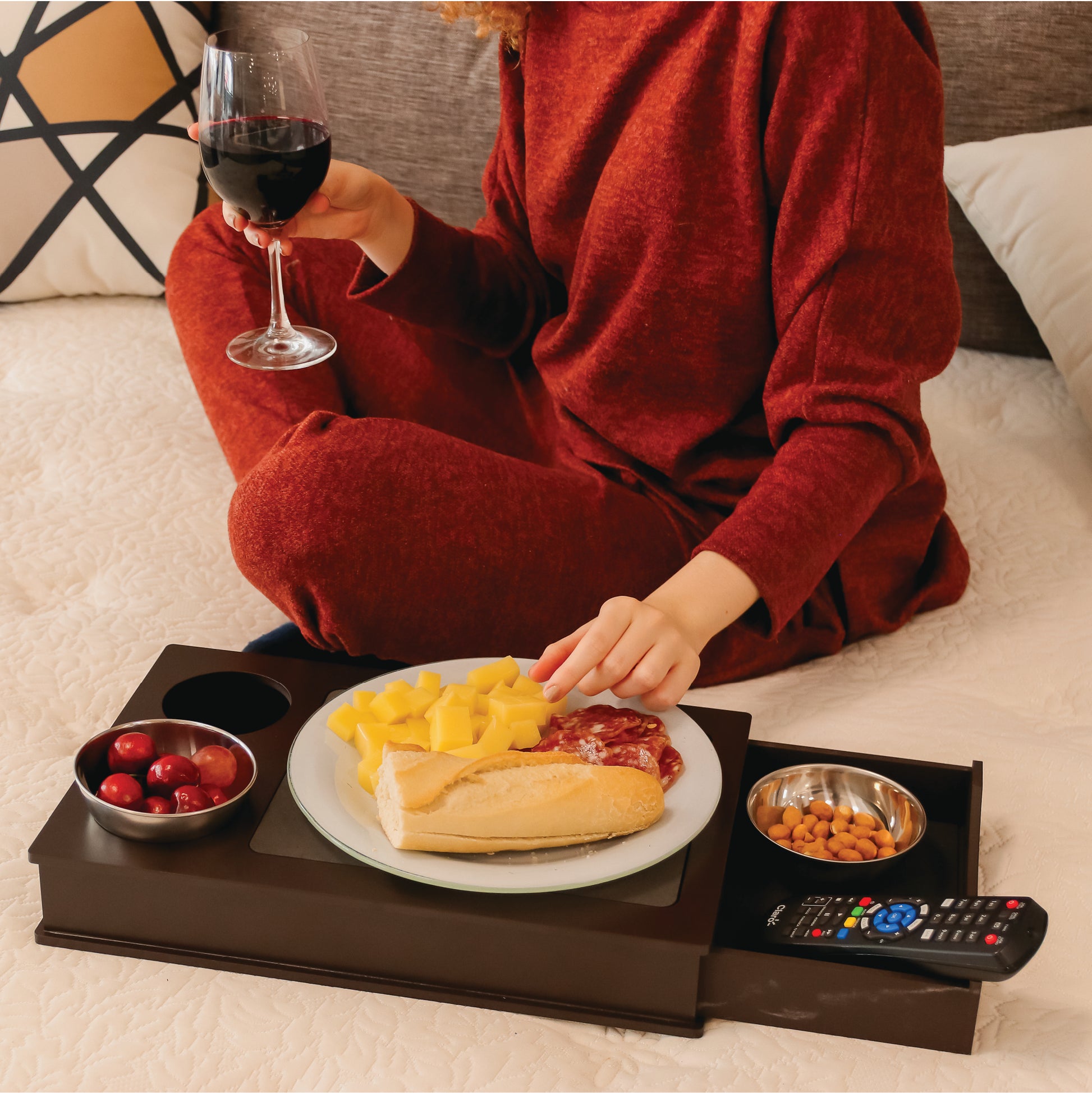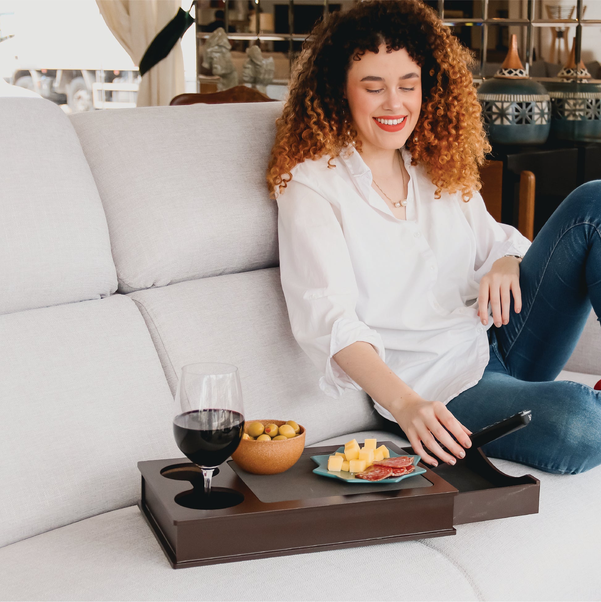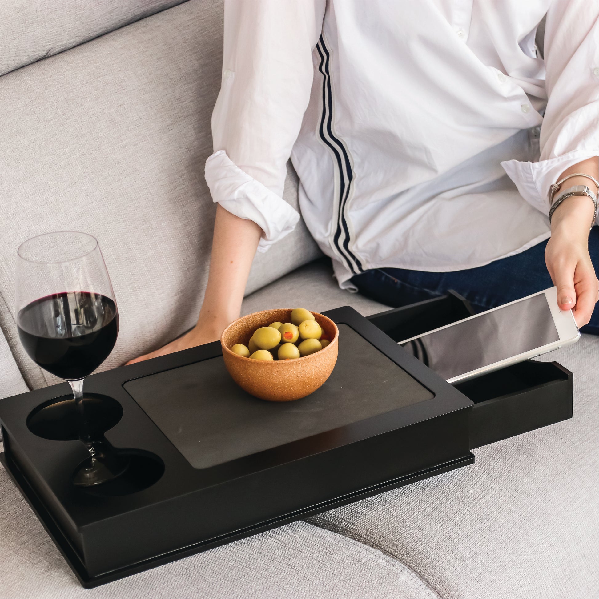 - Lounge with Ease - With our couch arm rest tray, you can relax on your sofa while having everything you need within your reach. This tray table has an Eva base, 2 drink holders and a drawer organizer for easy access to your snacks, gadgets, glasses, remote control, cell phone, snack, drink and more.