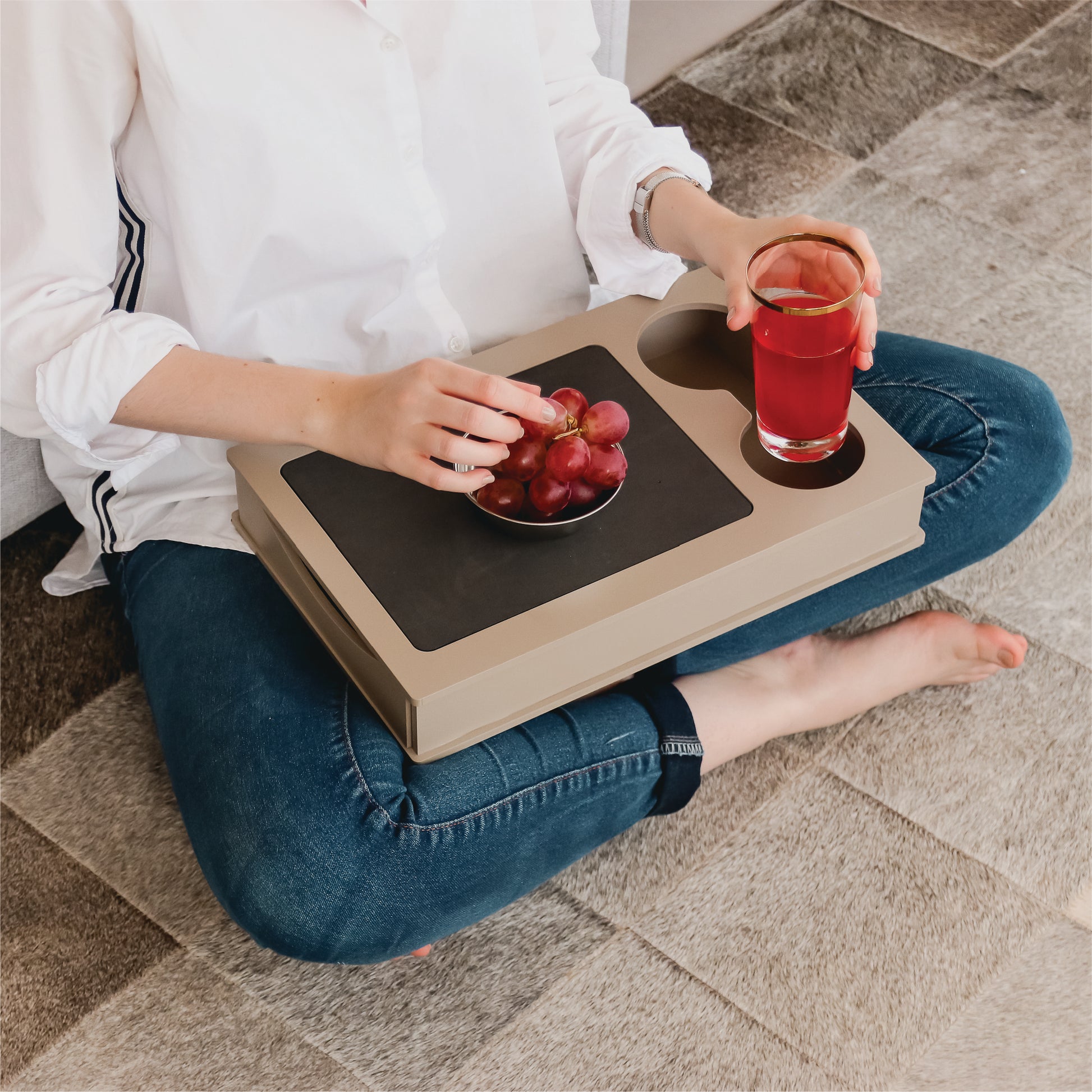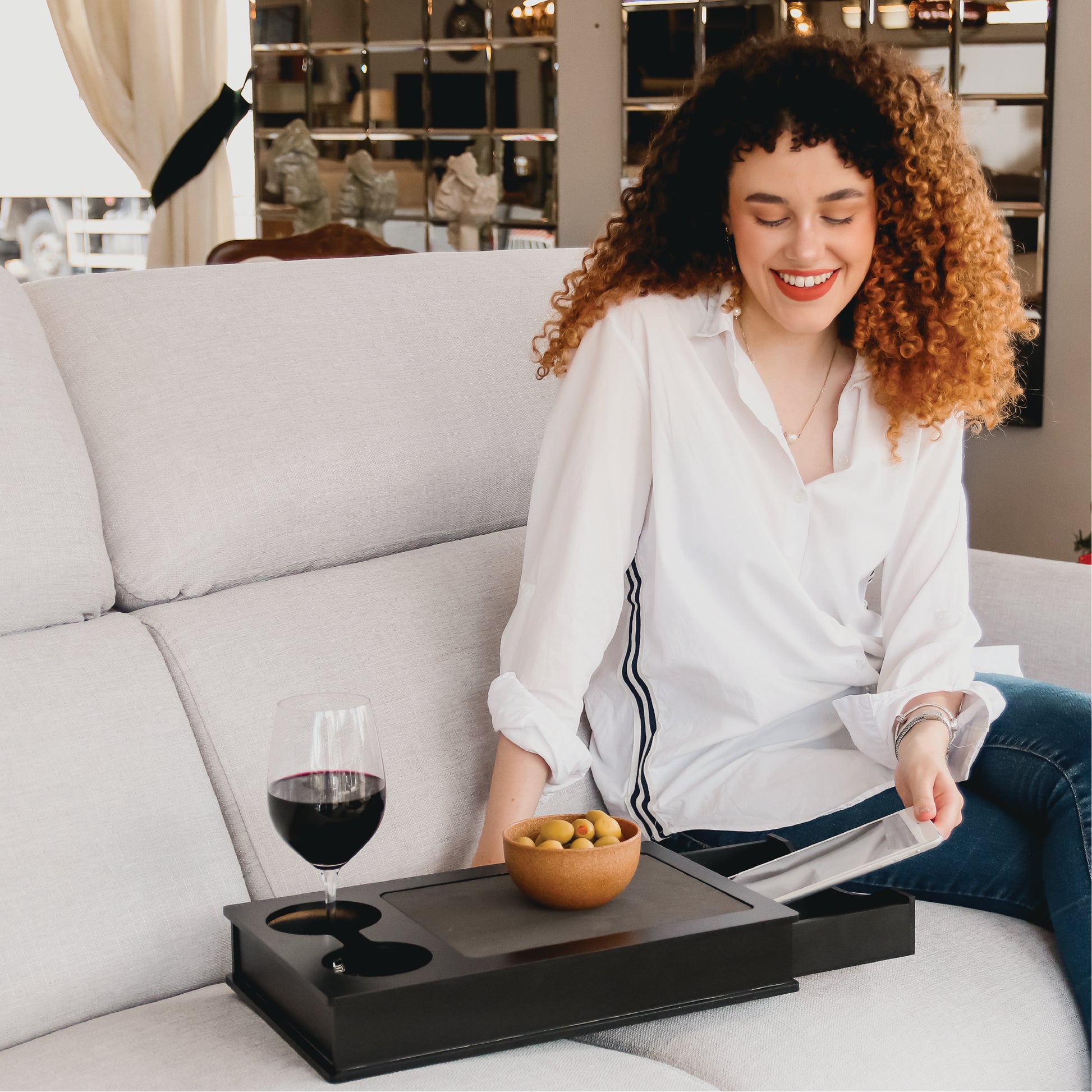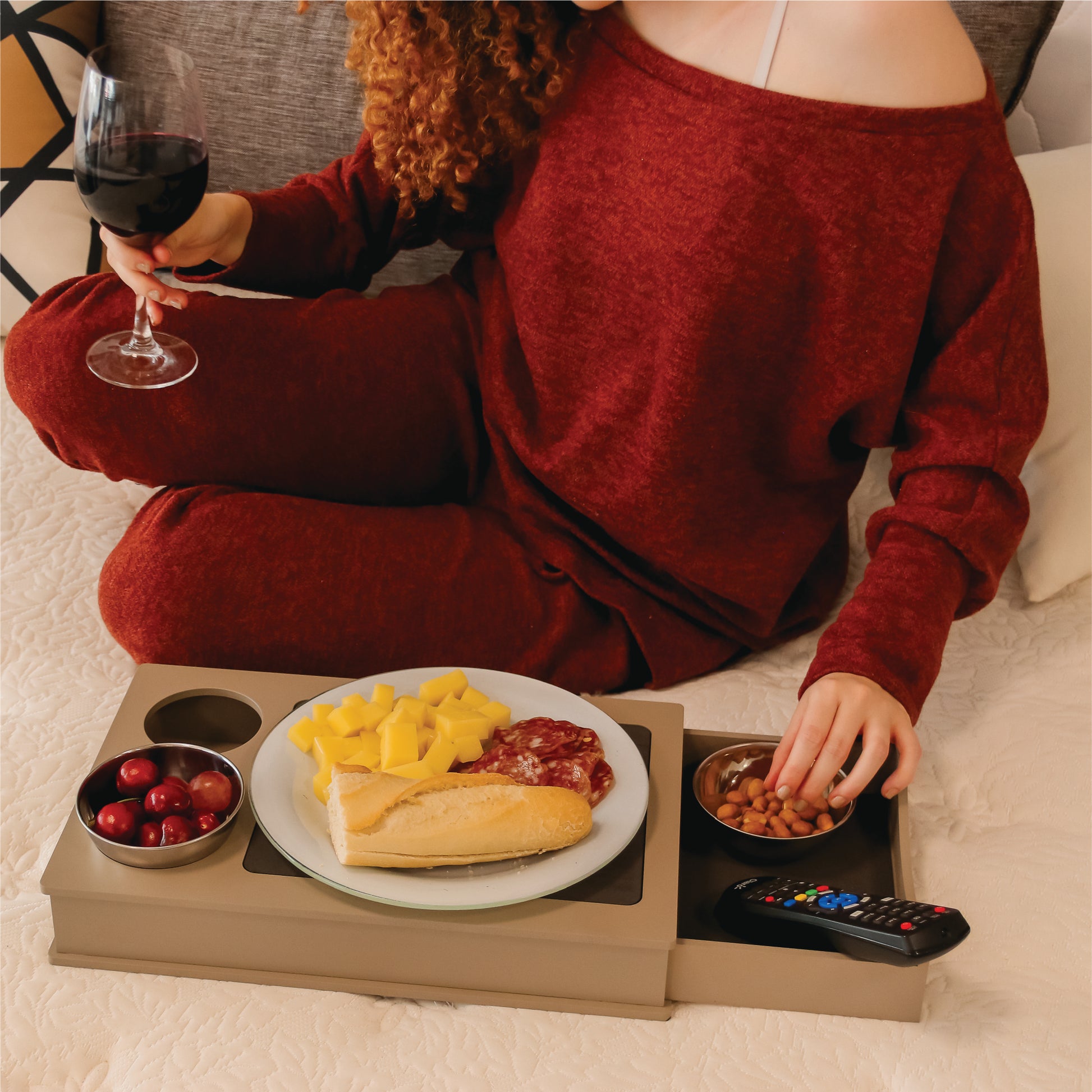 - Lounge with Ease - With our couch arm rest tray, you can relax on your sofa while having everything you need within your reach. This tray table has an Eva base, 2 drink holders and a drawer organizer for easy access to your snacks, gadgets, glasses, remote control, cell phone, snack, drink and more.