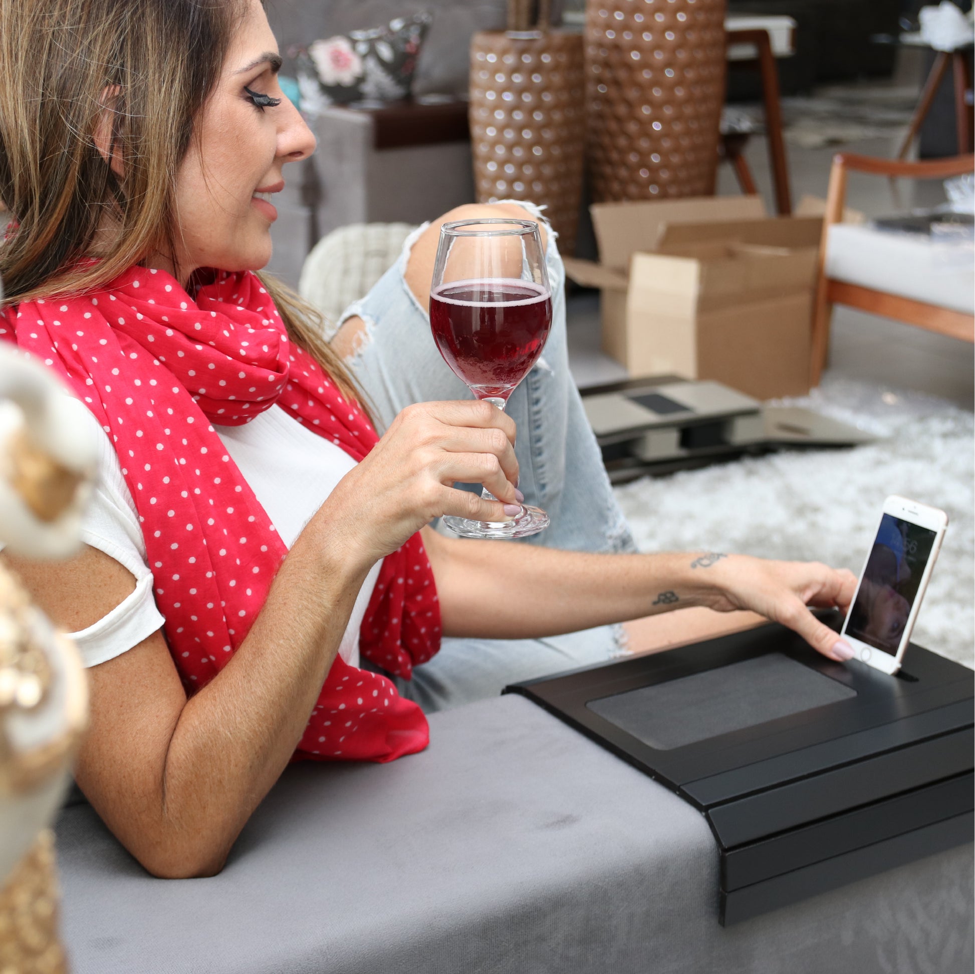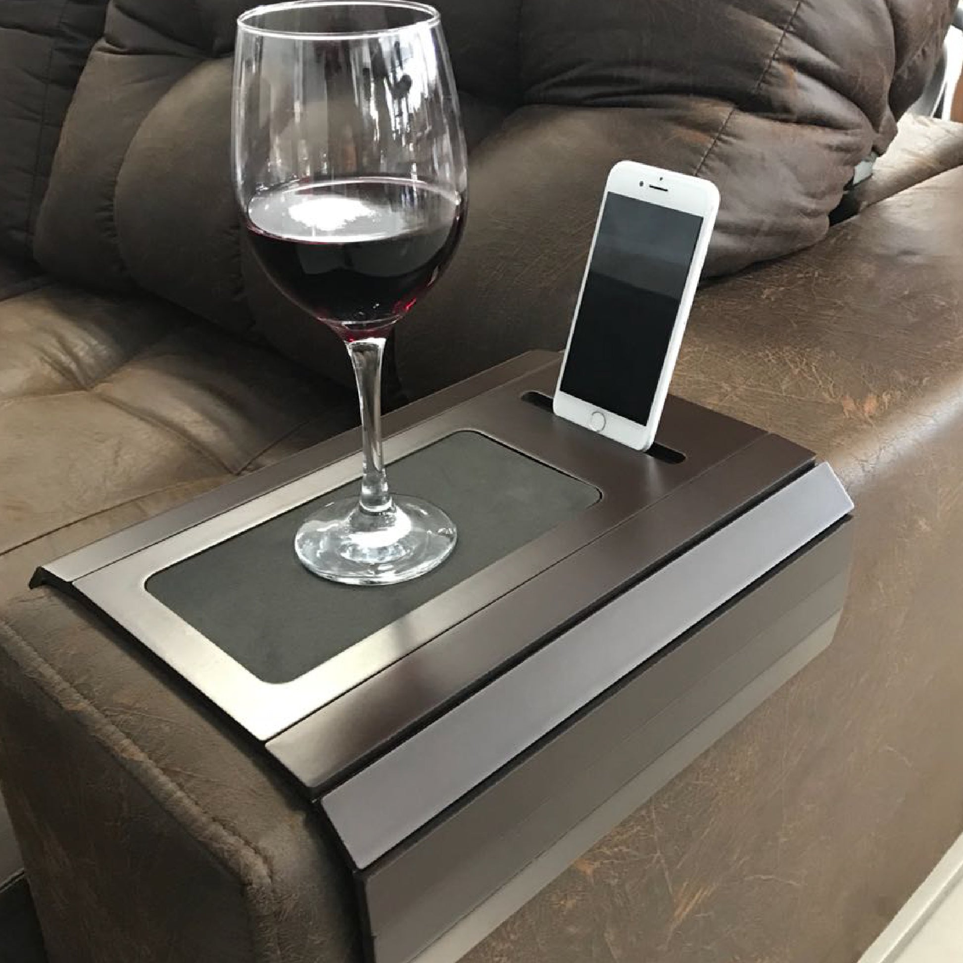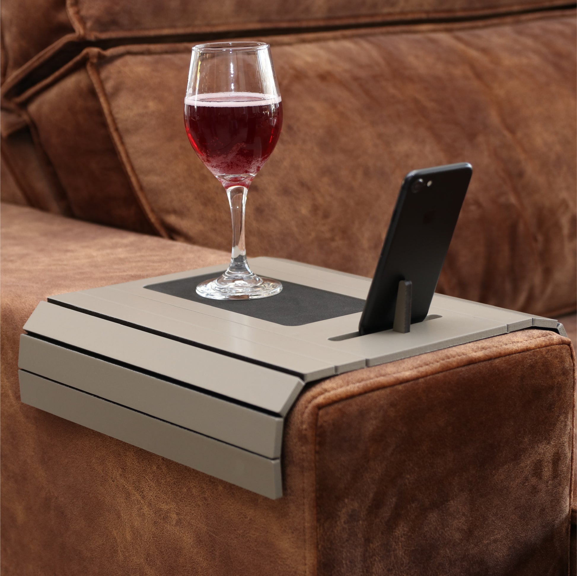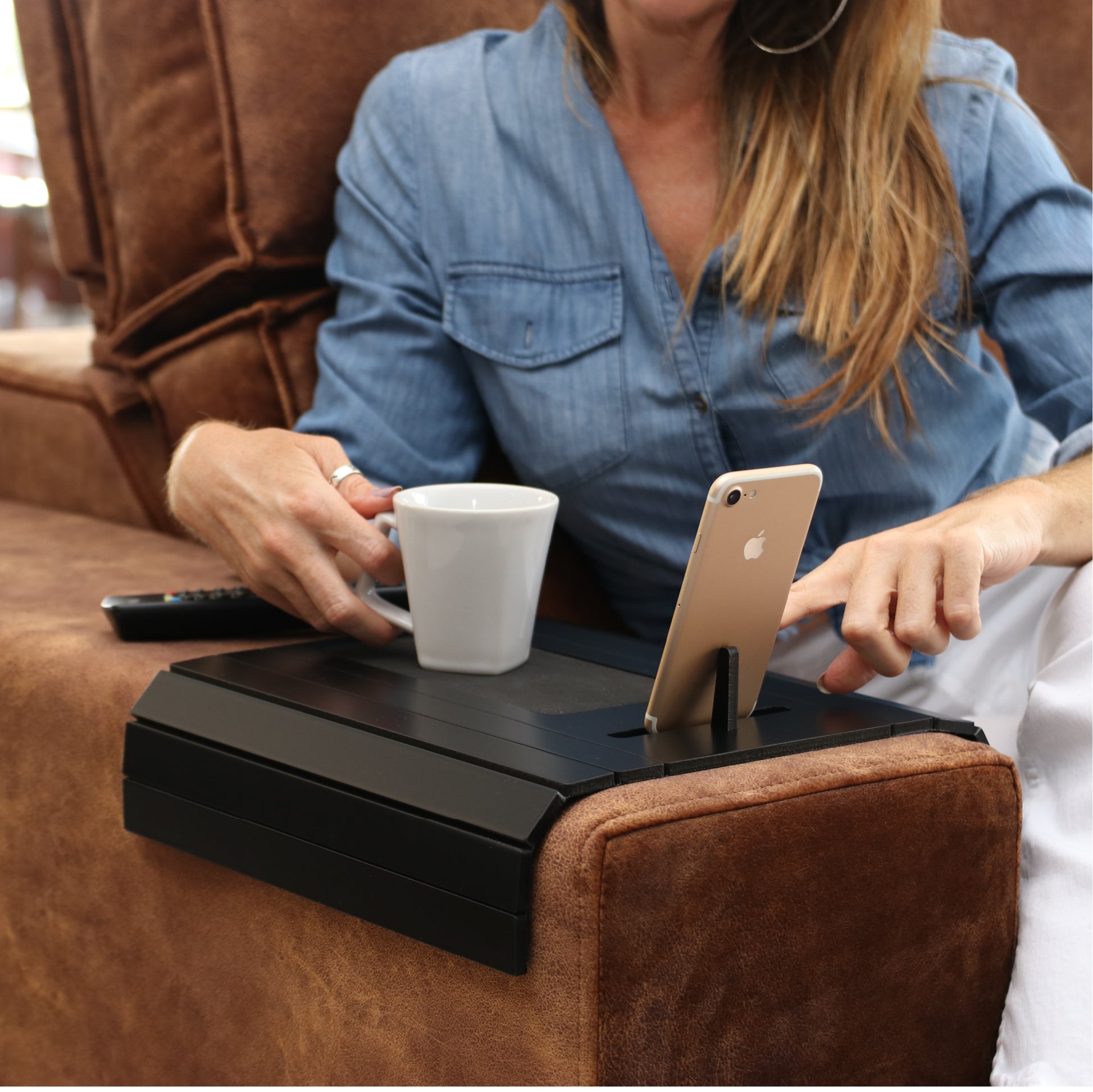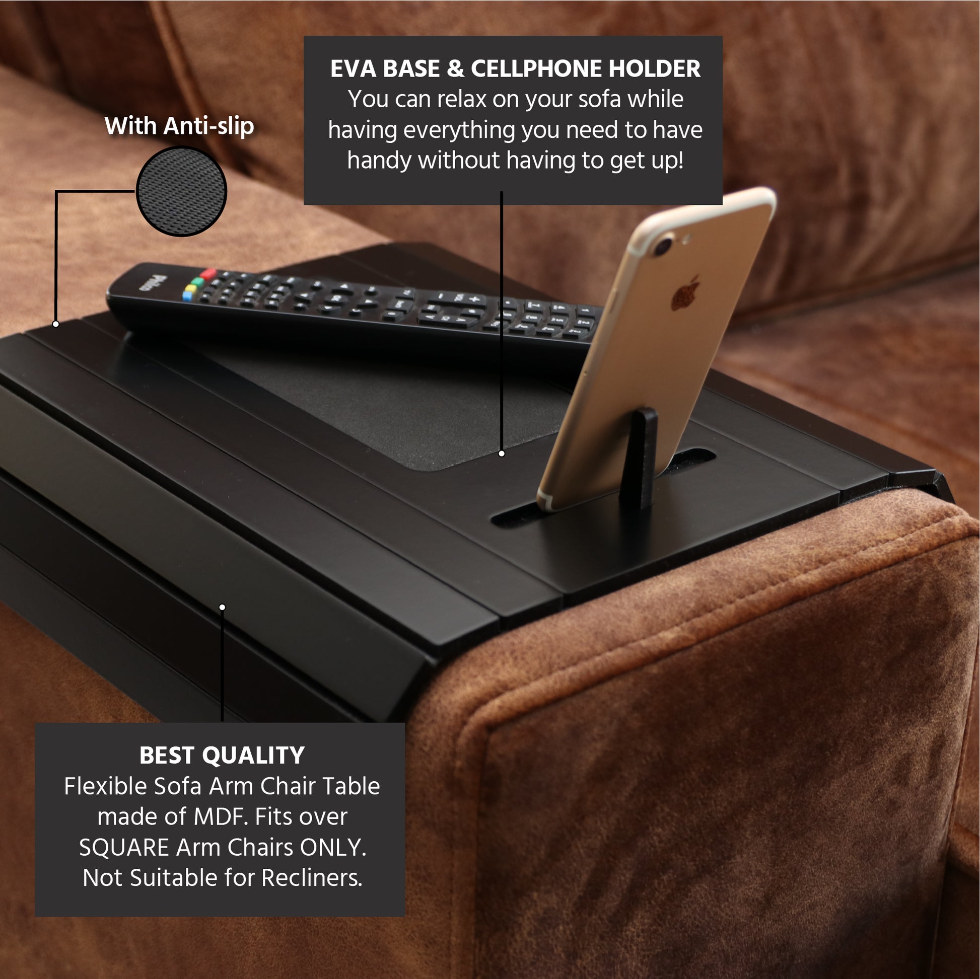 - Lounge with Ease - With our couch armrest tray, you can relax on your sofa while having everything you need like your cellphone within your reach. This sofa arm drink table has an anti-slip Eva base for easy access to your snacks, gadgets, remote control, and more and a cell phone holder.